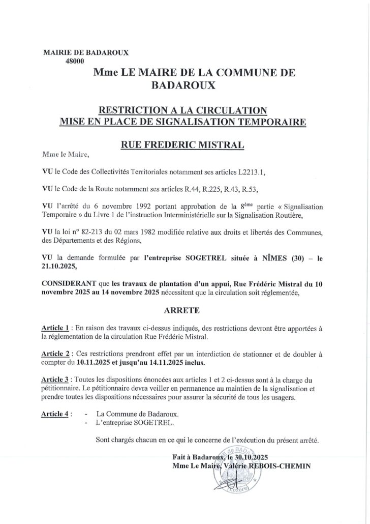La Commune de Badaroux lance une campagne de stérilisation de ses chats errants. Cette dernière aura lieu entre le 20 octobre et le 2 novembre 2025 et concernera une quinzaine d’animaux qui devront être trappés sur le territoire communal, au niveau de la traversée du village, avant d’être conduits à la clinique vétérinaire des Cytises à Mende puis relâchés.