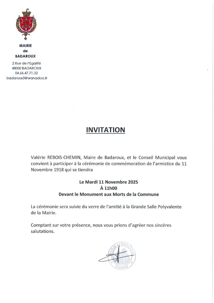 La Cérémonie de Commémoration de l’Armistice du 11 Novembre 1918 se tiendra Mardi 11 Novembre 2025 à 11h00 devant le Monument aux Morts de la Commune de Badaroux et sera suivie du verre de l’amitié à la salle polyvalente de la Mairie de Badaroux.